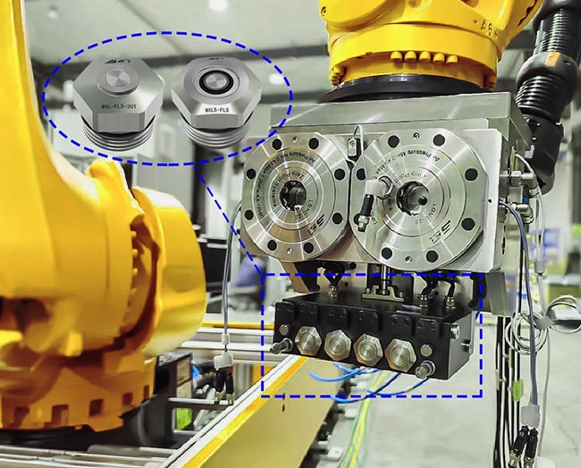 Kombinációs hatás: A teljes cserefolyamat automatizált. A robotoknak vagy aktuátoroknak csak a szerszámmodult kell a nullapont-keresőre "csatolni", ami automatikusan elvégzi a pontos pozicionálást és az erős reteszelést. Ugyanakkor a kétoldali szivárgásmentes csatlakozók automatikusan és megbízhatóan befejezik a dokkolást, azonnal biztosítva az áramellátást (folyadékot) és a vezérlőjeleket a szerszám számára. Leválasztáskor a sorrend fordított, először húzza ki a csatlakozót (szivárgás nélkül zárva), majd oldja fel a lokátort.