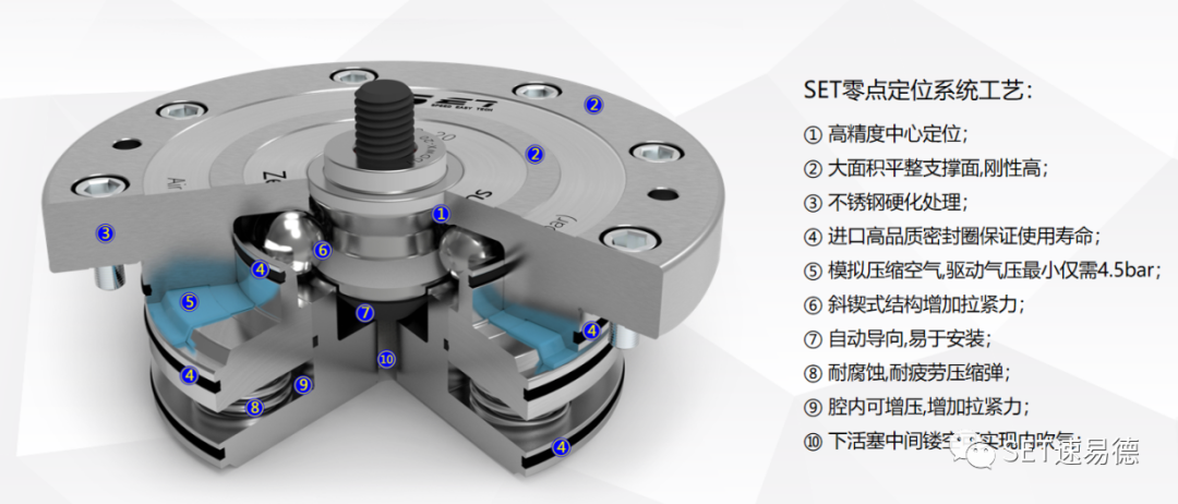A nulla pontos pozicionálási rendszer a szellőzés során kinyitott és a levegőből kinyitott reteszelő mechanizmushoz tartozik. Ha hidraulikus nyomást vagy légnyomást alkalmaznak a nulla pozicionáló rendszerre, a nyomás a dugattyún keresztül összenyomja az alatta lévő rugót, és az acélgömb mindkét oldalra terjed. A szorítás a belső erős rugótól függ, és normál működés közben nincs szükség levegőforrásra. A gyorsváltási rendszer különféle típusú pozicionáló modulokból áll, a használat nem azonos, a testváltozások, a köröm is megváltozik, pozicionálóra oszlik, pozicionáló csap, orientációs csap, reteszelő csap, a klasszikus "One Side Two Pin" pozicionáláshoz tartozik.