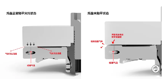 A tálca stabilitásának biztosítása és a pozicionálási követelmények teljesítése érdekében a nulla pozicionálónak hozzá kell adnia egy szorító detektáló eszközt, ennek az eszköznek a célja annak biztosítása, hogy a nulla pozicionáló teljes mértékben kapcsolatba léphessen a tálca pozicionáló felületével, és közepén nem lesz vasvágás vagy más törmelék. Munka alapelve az (1) ábrán látható. A detektáló levegő a lyukon kívüli (0,2 mPa) légnyomást enged. Állítsa be az áramlási érzékelő értékelési értékét. Ha a tálca nem lapos a pozicionálóval, amint azt a 2. ábra mutatja, akkor az észlelt menekülési gáz kifelé menekül a rés mentén, és az áramlási érzékelő meghatározza az áramlási különbséget, hogy megvalósítsa a szorítás észlelését. A detektáló lyuk 0,6mPa tisztítási nyomást is permetez kifelé, hogy biztosítsa a sztoma tisztítását. Több lokátor egyszerre észlelhető, ezáltal csökkentve a költségeket; 2. Miután több helyzetben van egy szivárgási áramlási érték, az következetlen lesz az előre beállított áramlási értékkel, tehát biztonságosabb; 3. A detektálási módszer közvetlenebb, a tálca nincs betöltve, és a pozicionáló üres klipje észlelhető.